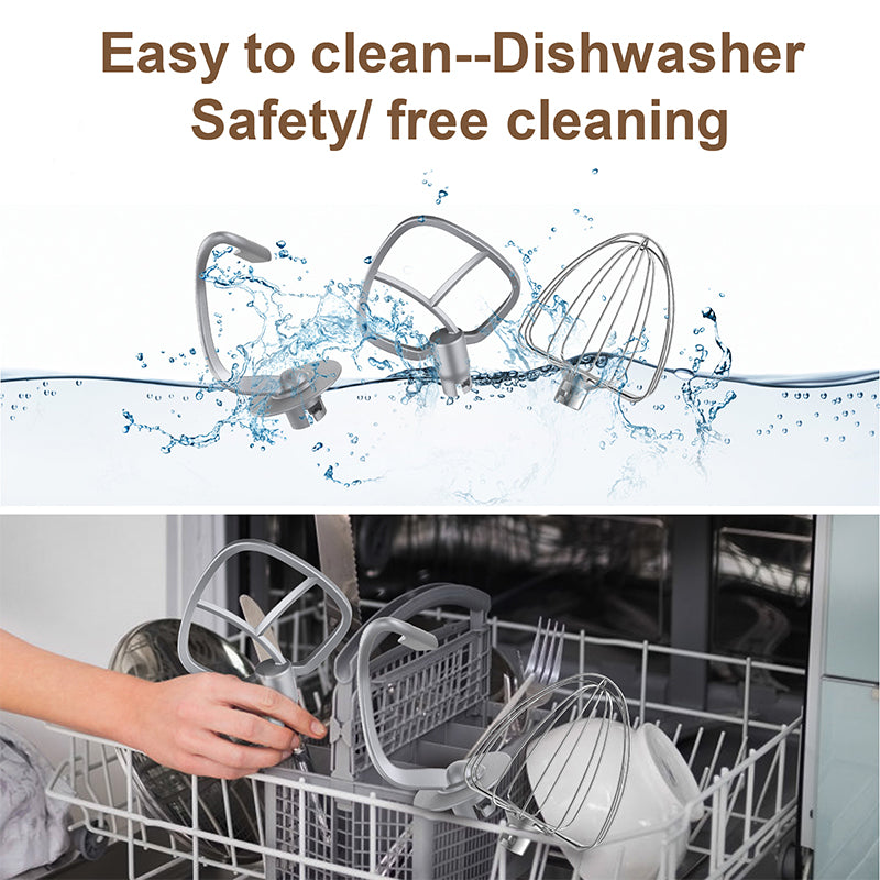 The set includes three sturdy, versatile attachments: a stainless steel whisk, an aluminum dough hook, and a mixing beater. Ideal for baking dough, biscuits, pastries, and more.